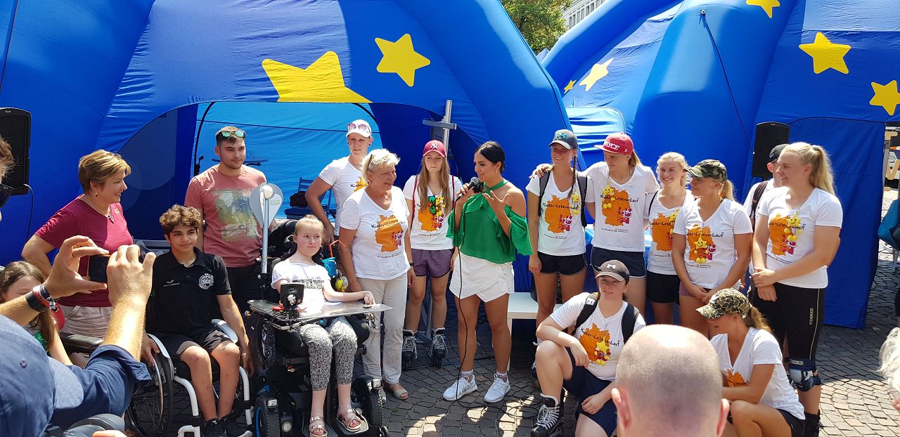 Der 04. August 2018 war der Tag des „Grüne-Bande-Laufs“. Am Stand der Aktion Kindertraum im Rahmen deren Jubiläumstour waren wir zu Gast, ich durfte dort auch an einer Talkrunde mit Ute Friese (Aktion Kindertraum) und Sabine Kraft (Bundesverband Kinderhospiz) teilnehmen, moderiert wurde diese Talkrunde von meiner lieben Freundin und Schirmherrin der Grünen Bande, Jessica „Jess“ Lange (vielen von Euch sicherlich aus dem KIKA bestens bekannt). Der Startschuss für unseren Lauf fiel dann gegen 13:40 Uhr auf dem Universitätsplatz in Heidelberg. Die 1. Etappe führte nach Hockenheim an den Flugplatz. Die Eishockey-Damenmannschaft der Mad Dogs Mannheim nahm die gut 20 Kilometer lange Strecke unter die Rollen ihrer Inline-Skates … und das bei 36°C Hitze – größten Respekt dafür!